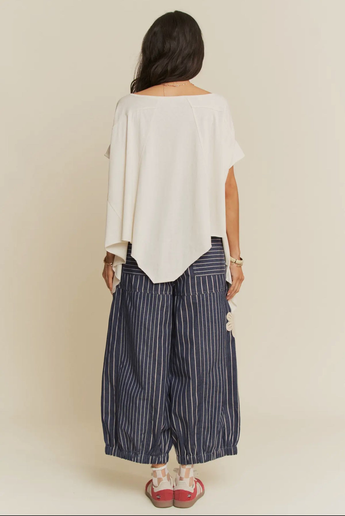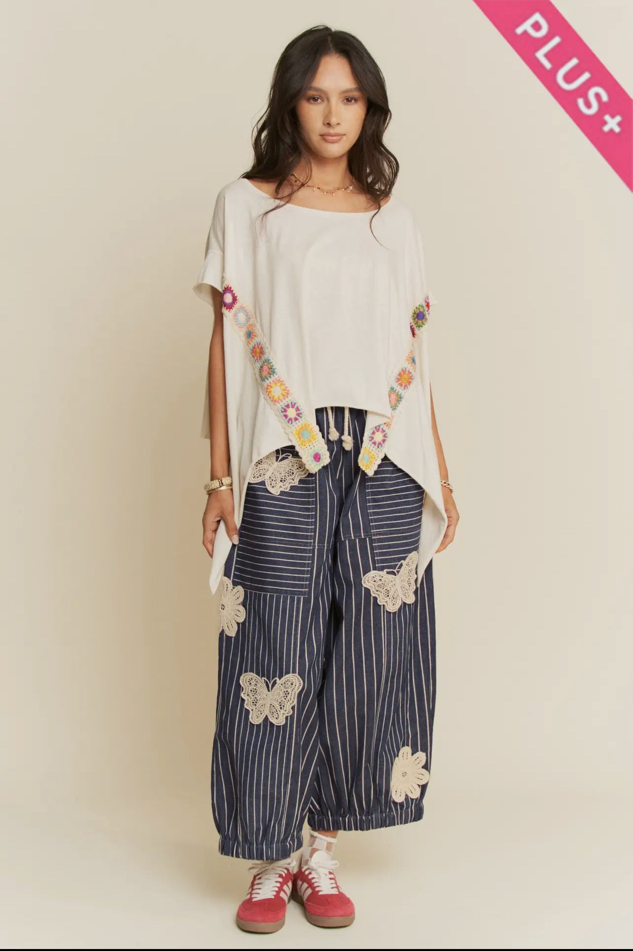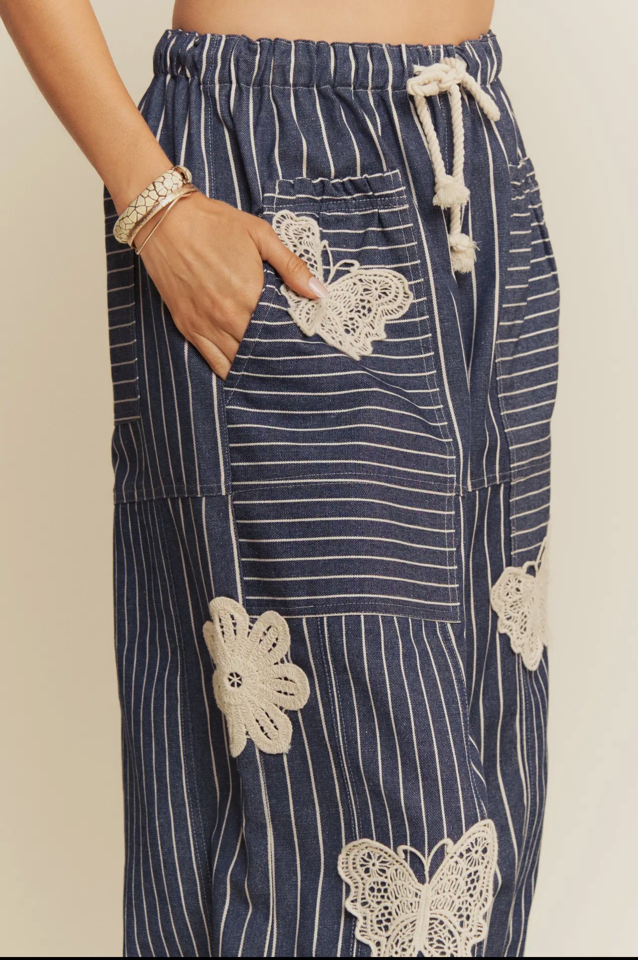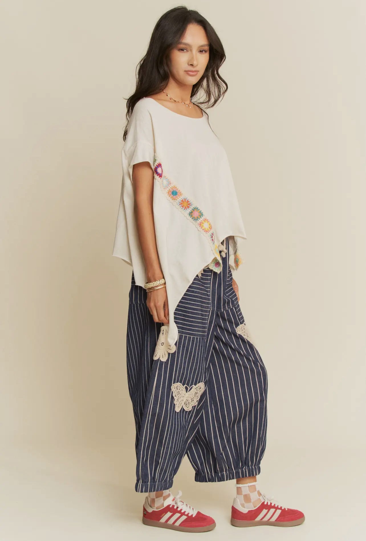 Navy blue cropped barrel leg pants with ivory pin stripes.Stunning crochet, flowers and butterflies design. These pants have a drawstring elastic waist and front and back pockets.